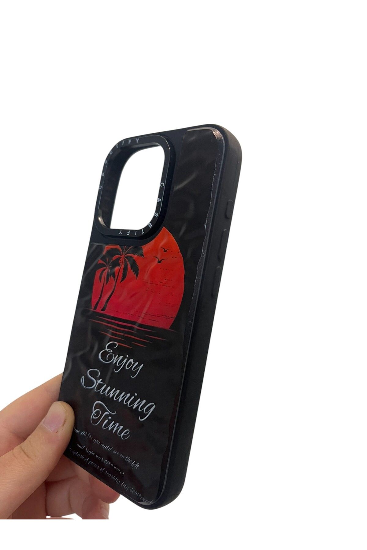 Siyah Rengi ve Enjoy Stunning Time kabartmalı baskısıyla iPhone 15 Pro’nuza tarz katarken, sert yapısıyla güçlü koruma sağlar.; Telefonunuzun şıklığını ve güvenliğini bir arada sunan Di Aksesuar telefon kılıfları, tüm telefon modelleriyle uyumlu, yüksek kaliteli tasarımıyla öne çıkıyor.; Şeffaf ve dayanıklı yapısıyla telefonunuzun orijinal görünümünü korurken, üstün darbe emici özelliği sayesinde günlük kullanımdaki çizilmelere, darbelere ve düşmelere karşı maksimum koruma sağlar.; Yüksek kaliteli esnek silikon malzeme, cihazınızı darbe emici bir katman ile kaplar ve uzun süre şeffaflığını koruyan özel kaplaması sayesinde sararma yapmaz.; Ultra ince ve hafif tasarımı ile telefonunuza ekstra bir ağırlık eklemeden ergonomik bir kullanım sunar.; Hassas kesimleri sayesinde tüm tuşlara, hoparlörlere ve şarj girişlerine tam uyum sağlar, böylece telefonunuzun fonksiyonelliğini hiçbir şekilde etkilemez.; Ayrıca, kablosuz şarj özellikli telefon kılıflarımızın %100 uyumlu olması, cihazınızı kılıfı çıkarmadan rahatça şarj etmenizi sağlar.; Kaymaz yüzeyi, elinizden düşmeyi önler ve mükemmel bir tutuş hissi sunar.; Kamera ve ekran koruması için yükseltilmiş kenar tasarımı, cihazınızın en hassas bölgelerini koruyarak uzun ömürlü kullanım imkanı tanır.; Tüm modeller için özel olarak üretilmiş premium telefon kılıfı, hem günlük kullanımda hem de uzun vadede en iyi deneyimi sunmak için tasarlanmıştır.; Şıklık, dayanıklılık ve üstün koruma bir arada! Telefonunuzu korurken tarzınızı da yansıtın Şimdi sipariş verin!
